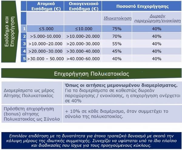Δωρεάν παραχώρηση | ενοικίαση : Η αίτηση γίνεται από τον επικαρπωτή ή τον πλήρη κύριο και η επιδότηση ανέρχεται στο 40% ανεξαρτήτου εισοδηματικής κατηγορίας.