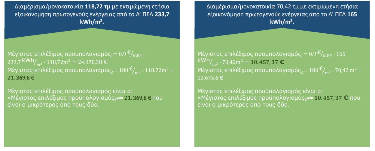 - Τα 1,10 € / τμ / kWh ετήσιας εξοικονομούμενης ενέργειας.