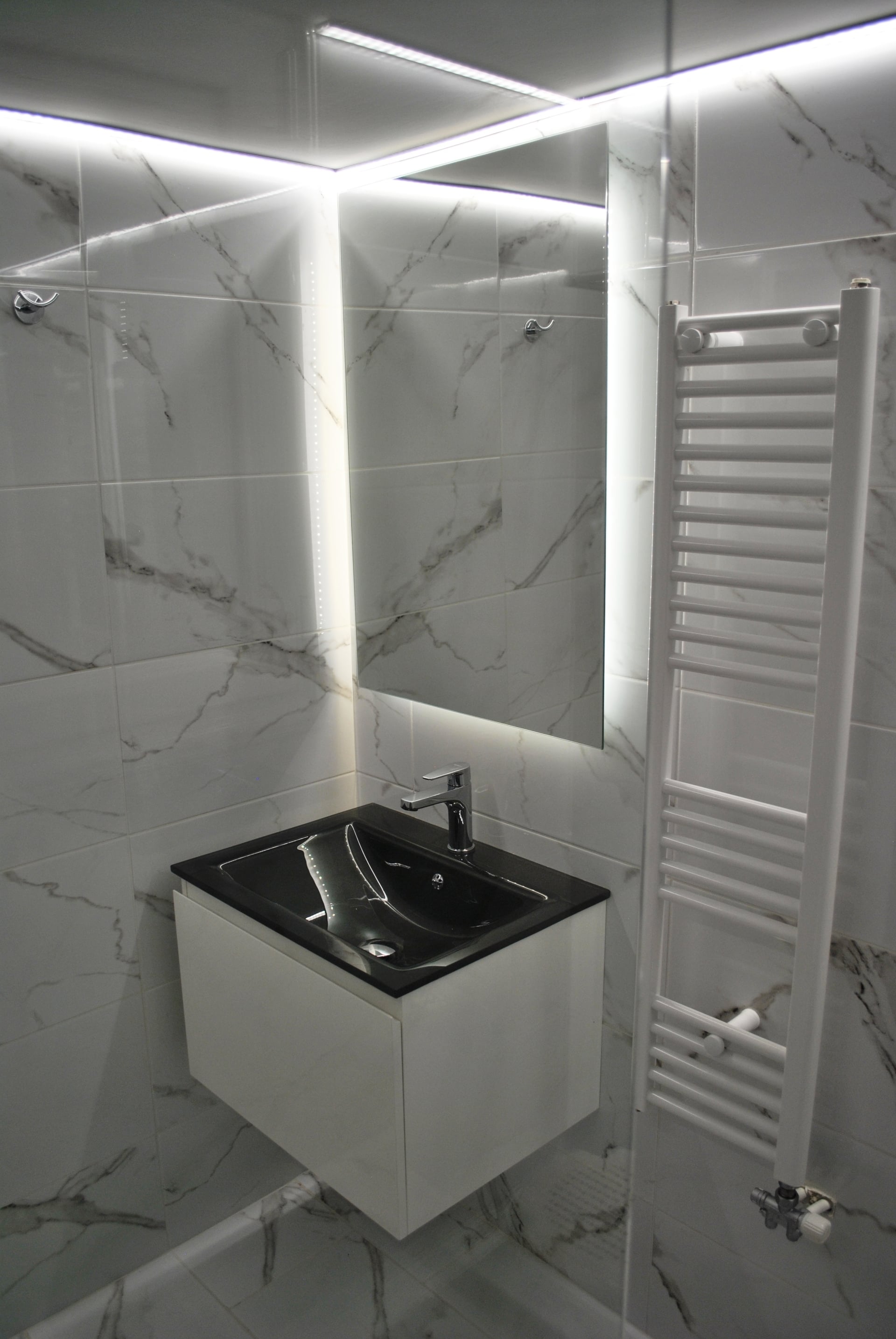 Έχει τοποθετηθεί έπιπλο μπάνιου με γυάλινο επικαθήμενο νιπτήρα. Περιμετρικά του μπάνιου εχει τοποθετηθεί κρυφός φωτισμός (led).
